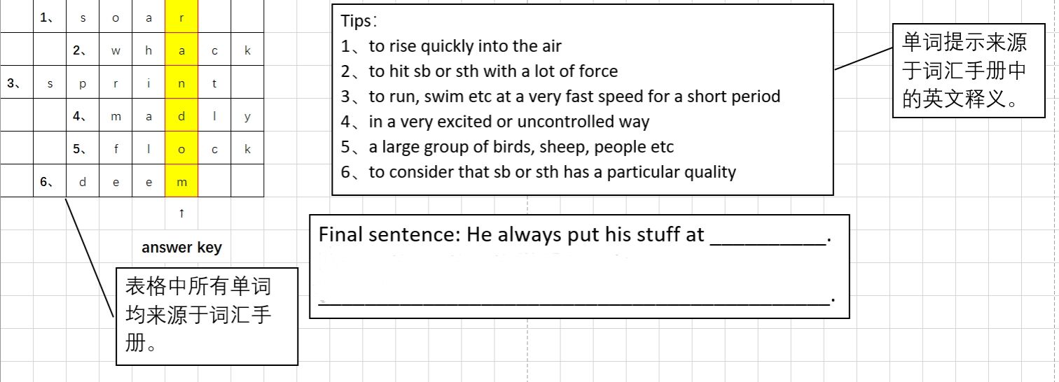 根据给出的英文释义写出单词,当所有正确的单词全部按顺序填入对应的题号中后,即可拼出最后的答案词,将正确的答案词填入句子中空缺的部分,每写对一个单词,小组加1分。形式见下图: