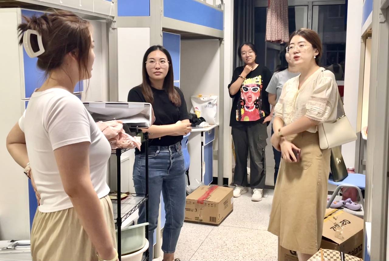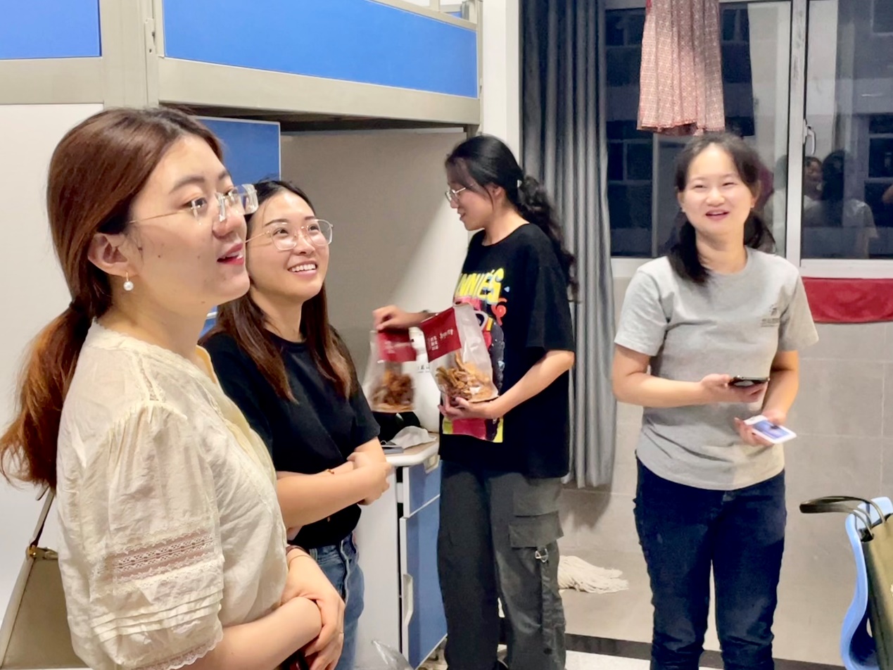 徐岚依次走访每个宿舍,首先亲切的对各位新生的到来表达欢迎,其次询问新生是否能适应宿舍环境,并亲自检查宿舍内部设施是否有故障或损坏,同时也嘱咐宿舍成员要和睦相处,互帮互助,积极向党组织靠拢,一起体验美好老员工活。刘葳兴亲切问候各位女生,勉励她们注重学业,全面发展。李俊伟表示宿舍成员要友好相处,共同提升。解长江勉励新生做好大学四年职业规划,努力提升专业知识水平。徐嘉婕真心关切员工,嘱咐员工好好相处,共同度过大学四年。祁明慧表示同学们如果有生活和学习上的问题可以第一时间联系自己,并叮嘱同学们在日常生活中要注意自身安全,多多参加公司文体活动。
