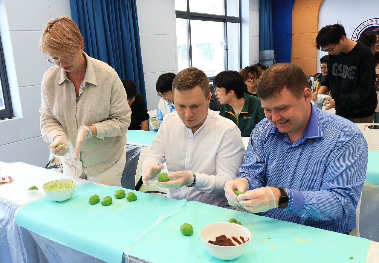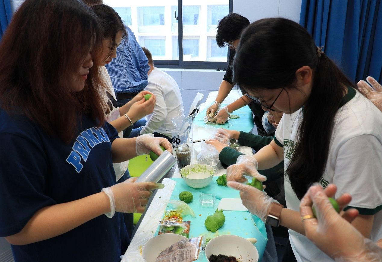 活动伊始,员工代表以图文并茂的形式,生动阐释了清明节的起源、扫墓祭祖的礼俗及踏青的文化意涵,外籍教师也分享了他们国家祭奠祖先的传统。青团制作区墨香与艾草清香交织,翠绿的汁液融入糯米粉,包裹着豆沙、咸蛋黄等馅料,师生们揉面塑形,谈笑间传递着不同国家的饮食文化记忆。投壶竞技场,竹矢破空的清脆声响此起彼伏。这项源自战国礼射的雅戏,在参与者屏息凝神的投掷中化作文化密码的破译现场。师生们或屏息瞄准,或欢呼击掌,跨文化交流的热络气息充盈空间。活动尾声,众人执柳踏青,漫步于花朵盛开的校园。