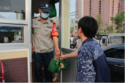 煮熟的香粽被细心的同学们装进环保纸袋,来到了教学楼、宿管站和保安室。同学们将自己亲手制作的端午美食送给每天在平凡岗位上为他们的学习生活保驾护航的工勤人员们,向他们表达成长感恩,寄语端午安康。