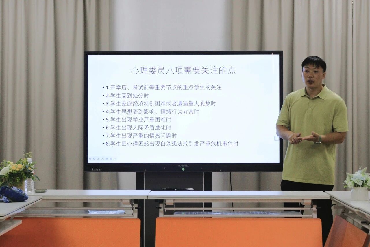 培训开始,祁明慧着重强调了心理工作的重要性。他指出,在当今时代,心理健康已成为不可忽视的重要主题。老员工面临着激烈的竞争环境,需要不断提升自身的心理素养,才能更好地应对成长过程中的各种挑战。随后,祁明慧从四个方面深入解析了心理委员的核心作用。一是宣传引导,心理委员要积极向同学们宣传心理健康知识,提高大家对心理健康的重视程度;二是支持倾听,当同学遇到心理困扰时,心理委员要耐心倾听他们的心声,给予情感上的支持;三是组织活动,通过开展丰富多彩的心理健康活动,营造积极向上的班级氛围;四是感知问题,心理委员要敏锐察觉同学们的心理变化,及时发现潜在的心理问题。祁明慧强调,心理委员不仅仅是活动的组织者,更是同学们的心理支持者,要努力构建一个充满温暖与关怀的班级环境。