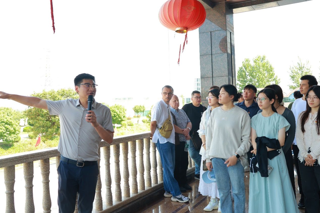 在施河镇土楼村,村党总支书记陈立功带领中外师生在村里参观。小桥流水、曲径通幽,庭院深处有人家,一幅和美乡村的画卷从村口处徐徐展开。陈立功向师生们介绍了土楼村坚持党建引领,积极构建自治、法治、德治相融合的基层治理体系;坚持以文塑景,传承和发掘和善孝亲传统伦理和耕读文化,打造特色田园乡村;坚持以人居环境整治为抓手,开展景观交互、美丽庭院、生态修复、业态升级等工作,全面提升村庄环境;利用闲置土地种植杞柳,发展庭院经济,利用闲置校舍招引羽绒加工项目,实现产业振兴,富民强村的发展历程。
